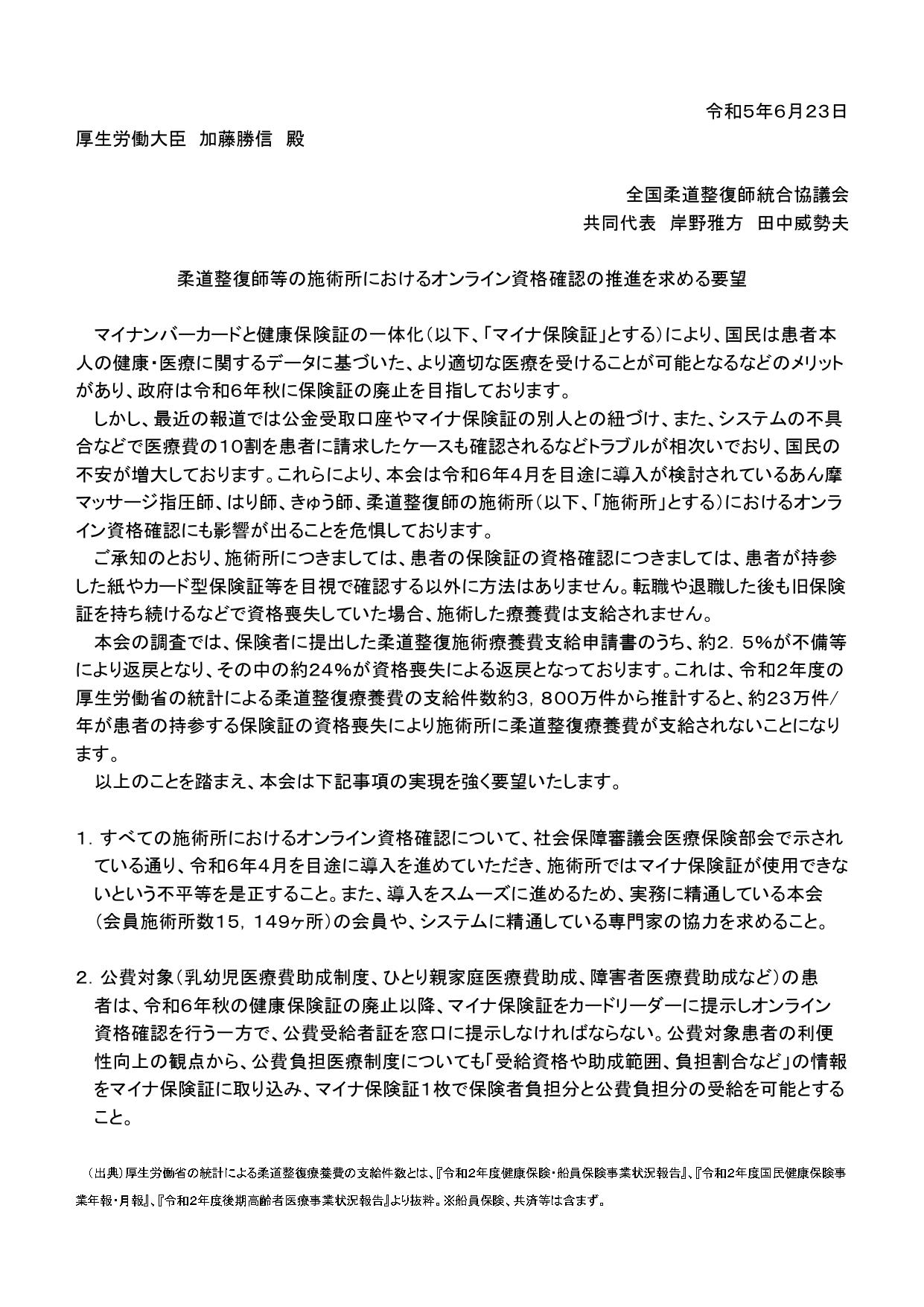 加藤厚生労働大臣にオンライン資格確認に関する要望書を提出 活動報告 2023.06.232023.06.25 全国柔道整復師統合協議会(共同代表:岸野雅方、田中威勢夫。会員施術所数15,149ヶ所)は、加藤勝信厚生労働大臣に対してすべてのあん摩マッサージ指圧師、はり師、きゅう師、柔道整復師の施術所において、社会保障審議会医療保険部会で示されている通り、令和6年4月を目途にオンライン資格確認の導入を進めることを求める要望書を提出しました。